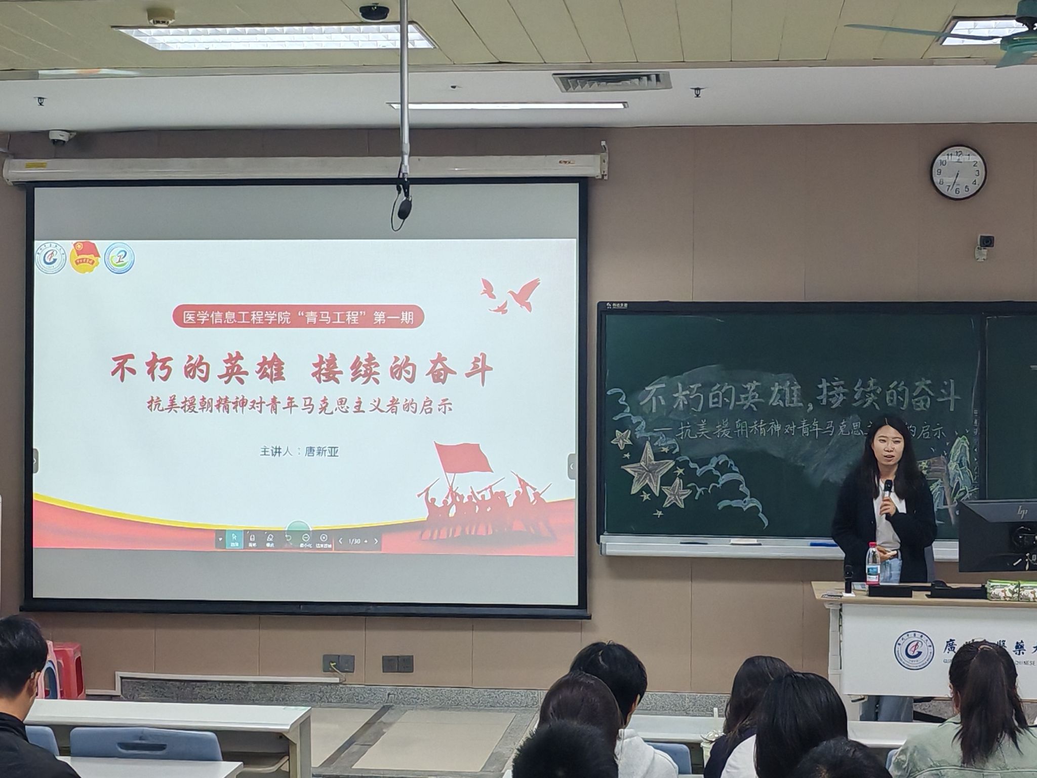 唐新亚老师以“不朽的英雄,接续的奋斗——抗美援朝精神对青年马克思主义者的启示”为题,为学员们讲授了一节生动的党史课。她以宏阔的历史视角,系统梳理了抗美援朝五次战役的演进脉络与战略深意,通过翔实的史料与生动的讲述,带领同学们回顾了从云山阻击战到铁原坚守战的烽火征程,深刻阐释了志愿军将士以“钢少气多”的英雄气概所谱写的不朽篇章。在重温杨根思、黄继光、邱少云等英烈的感人事迹时,现场气氛庄严肃穆,他们崇高的爱国主义精神深深震撼了每一位学员。唐老师指出,抗美援朝精神不仅是历史的回响,更是新时代青年坚定理想信念、砥砺初心使命的宝贵精神财富。她鼓励大家以抗美援朝精神为指引,将个人理想融入国家发展大局,在实现中华民族伟大复兴的征程中勇担使命、接续奋斗。