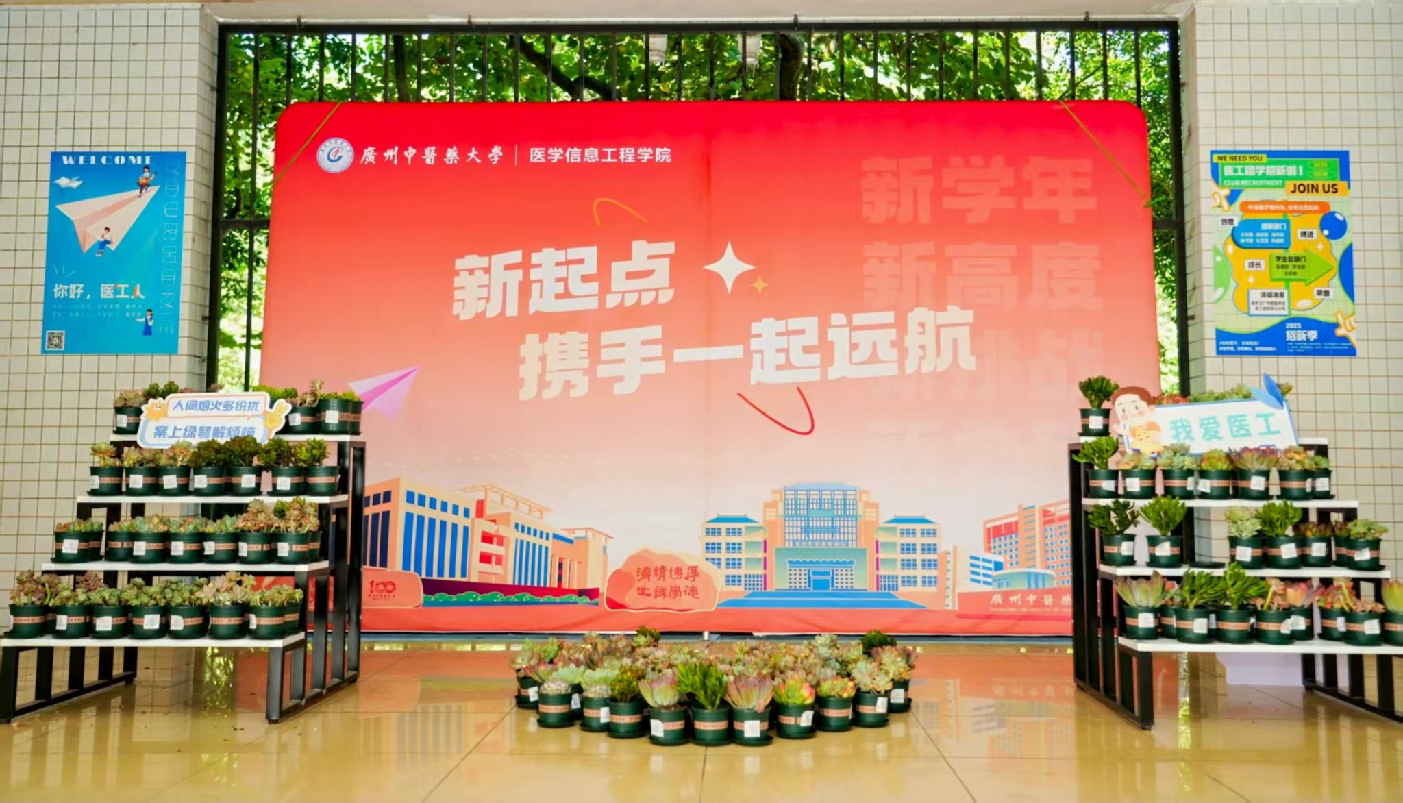 上午八时,迎新报到工作在大学城校区正式启动。公司设置多个报到点位,由新生辅导员和员工志愿者为新生提供一站式注册服务。今年,公司特别以“绿色迎新”为主题,现场布置多肉绿植盆栽,既环保又洋溢生机,新生可自由领养留念。迎新过程中,生物医学工程专业曹琼雯同学报到后,主动为迎新志愿者送上饮用水,传递出互助友爱的校园风尚。公司专设“党员先锋岗”,学工办主任吴柳书老师现场为新生及家长答疑,充分发挥党员教师的模范带头作用。