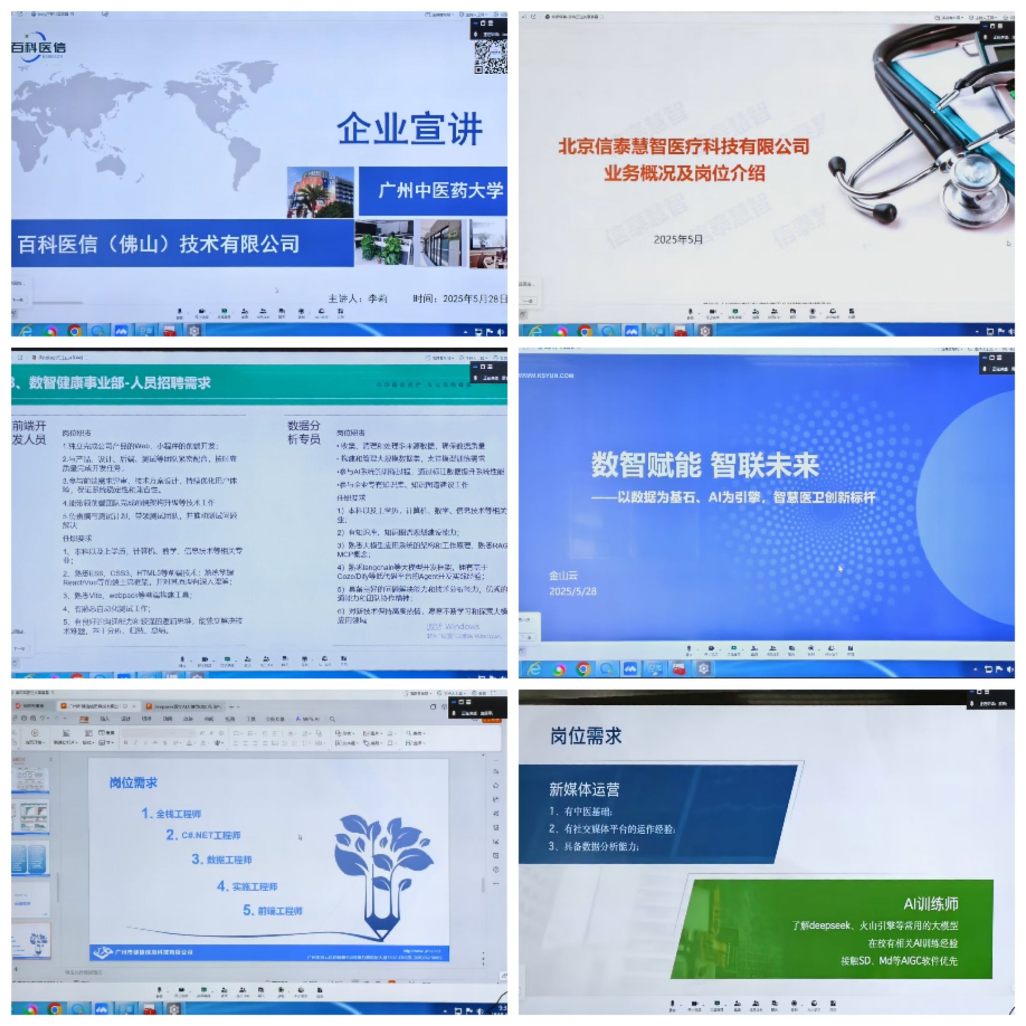北京信泰慧智医疗科技有限公司、珠海金山云科技有限公司、广东康合慢病防治研究中心有限公司、百科医信(佛山)技术有限公司、腾云悦智科技(深圳)有限责任公司、广州市健信信息科技有限公司、广州岐黄信息科技有限公司、广州市新页信息技术有限公司、广州医博信息技术有限公司等9家企业先后围绕各自的企业文化、核心主营业务、人才发展战略及具体招聘需求等方面展开详细介绍。