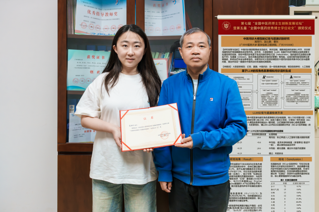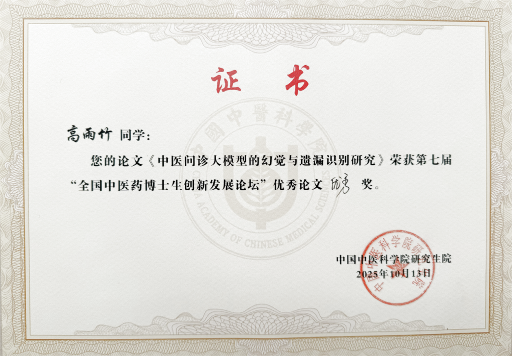 近日由中国中医科公司主办的第七届“全国中医药博士生创新发展论坛”在江苏苏州举行,同期开展第五届全国中医药优秀博士学位论文评选工作。tyc41183太阳成2024级博士研究生高雨竹(指导老师:曹东)的论文《中医问诊大模型的幻觉与遗漏识别研究》表现突出,荣获“优秀论文优秀奖”,充分展现了医工公司在中医药与信息工程交叉领域人才培养的实际成效。